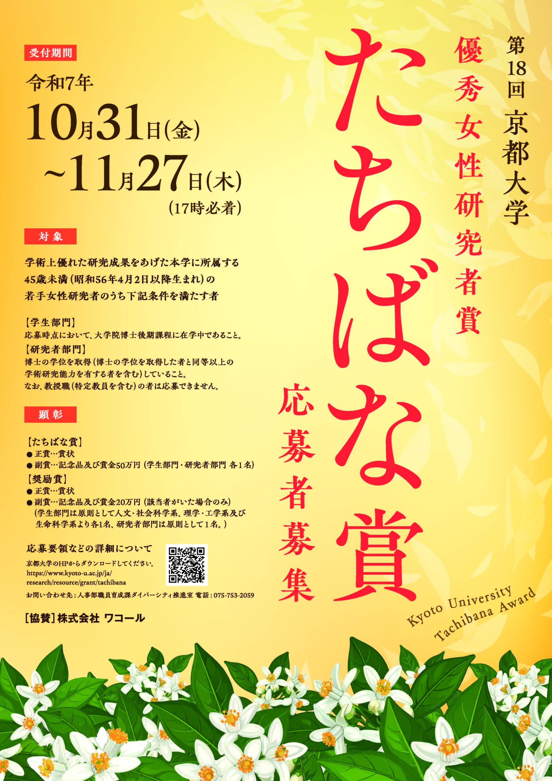 第18回京都大学たちばな賞(優秀女性研究者賞)の応募者募集 (11月27日(木曜日)17時00分必着)